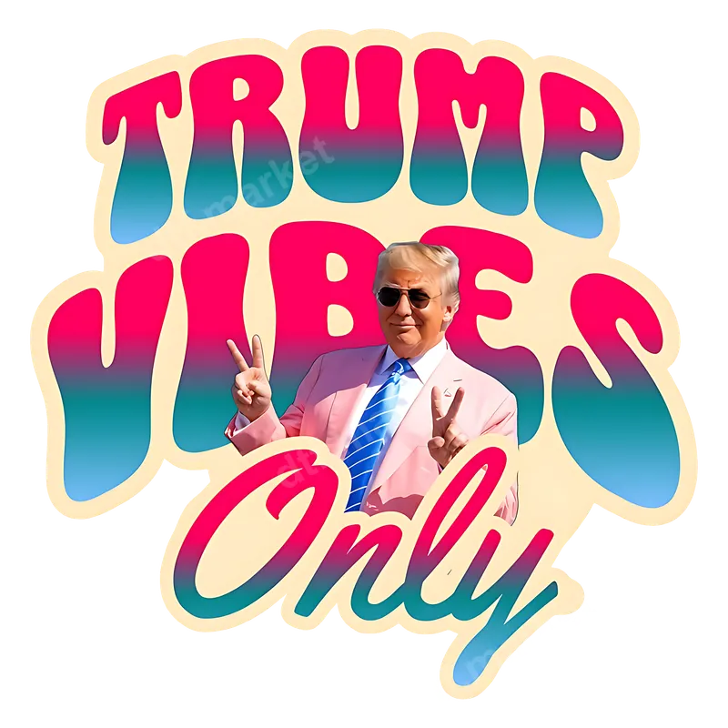 See allThis eye-catching 'Trump Vibes Only' DTF transfer blends political expression with a fun, retro aesthetic. Featuring Donald Trump in a vibrant pink suit giving peace signs, surrounded by bold, groovy lettering with a pink and teal gradient, this design is sure to stand out. It's a ready to press design that offers a unique way to display a specific political stance with a touch of vintage flair and humor, perfect for personalizing your wardrobe. Ideal for Donald Trump supporters, political humor enthusiasts, or anyone who appreciates a distinctive retro style. This versatile design makes a great gift for conservatives, a statement piece for political rallies, or a fun addition to everyday casual wear. Create custom apparel that sparks conversation and shows off your unique personality and political leanings in a lighthearted manner. Our professional DTF transfers are incredibly easy to apply, perfect for cotton, polyester, and blend fabrics. Simply use a heat press at 280-300°F for 6-10 seconds with medium pressure, then instantly peel for a flawless finish. No complex weeding or layering required, making these heat transfer designs much simpler than traditional vinyl transfers. For those without a heat press, a household iron can also be used with careful application. Experience superior quality with our durable and vibrant apparel transfers. Each direct to film transfer is printed on professional-grade DTF film, ensuring bright colors, excellent crack resistance, and a soft-to-touch feel that integrates seamlessly with the fabric. These t-shirt transfers are designed to last through countless washes, maintaining their integrity and bold appearance on all your favorite garments.