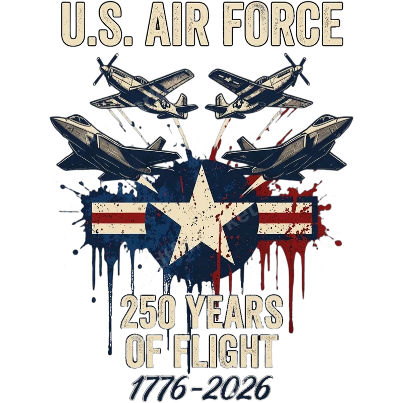 See allThis patriotic U.S. Air Force DTF transfer is a stunning way to honor the legacy of American aviation. Featuring both vintage propeller planes and modern stealth jets, along with a distressed American flag backdrop, this ready to press design commemorates '250 Years of Flight' from '1776-2026'. It's a powerful statement piece for any garment, blending historical respect with contemporary pride. Ideal for active service members, veterans, aviation enthusiasts, and proud patriots, this heat transfer makes an excellent gift for Father's Day, Memorial Day, Veterans Day, or any occasion celebrating military pride. Create custom apparel for family reunions, squadron events, or simply to show your unwavering support for the brave men and women of the Air Force. Applying this high-quality iron on transfer is simple with a heat press at 300-325°F for 15 seconds with medium pressure, or it can even be applied using a household iron for smaller applications. Our durable heat press design ensures vibrant results on cotton, polyester, and most fabric blends without the need for weeding, making your customization process quick and easy. Every shirt design from dtf.market is crafted with professional-grade DTF film, providing a soft, flexible feel that resists cracking and peeling. Experience exceptionally vibrant colors and a crisp finish that will last wash after wash, making it perfect for long-lasting t-shirt transfers and more.