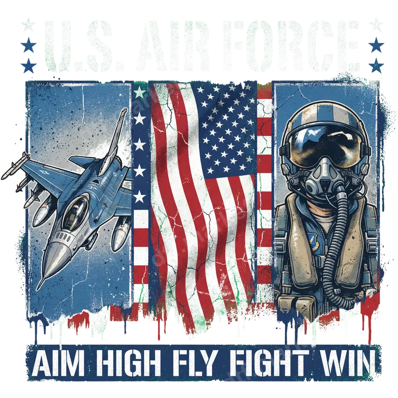 See allThis U.S. Air Force DTF transfer design embodies patriotic spirit and military pride with a powerful, distressed aesthetic. It features a sleek F-16 fighter jet soaring on the left, an iconic American flag with a weathered look at its core, and a resolute Air Force pilot in full gear on the right. Emblazoned with the motivational slogan "AIM HIGH FLY FIGHT WIN," this graphic is a ready to press tribute to the brave men and women of the Air Force. Perfect for active duty service members, veterans, their families, and proud patriots, this design makes an excellent t-shirt transfer for showing support on special occasions. It’s ideal for celebrating Veterans Day, Memorial Day, the 4th of July, or as a heartfelt gift for military homecomings and deployments. This versatile ready to press design allows you to create custom apparel that truly honors service and sacrifice. Applying this vibrant heat transfer is effortless. It adheres beautifully to a wide range of fabrics, including 100% cotton, polyester, and various blends. Simply use a heat press at 300-325°F for 15 seconds with medium pressure, then cold peel the film. While a heat press is recommended for optimal results, a household iron can also be used with care. There's absolutely no weeding required, making your customization process quick and hassle-free. Crafted with professional-grade DTF film, this iron on transfer guarantees exceptional durability and a soft hand feel. The colors are incredibly vibrant, sharp, and designed to resist cracking or fading even after numerous washes. Enjoy a high-quality, long-lasting apparel transfer that looks professional and feels comfortable, reflecting your pride in every wear.