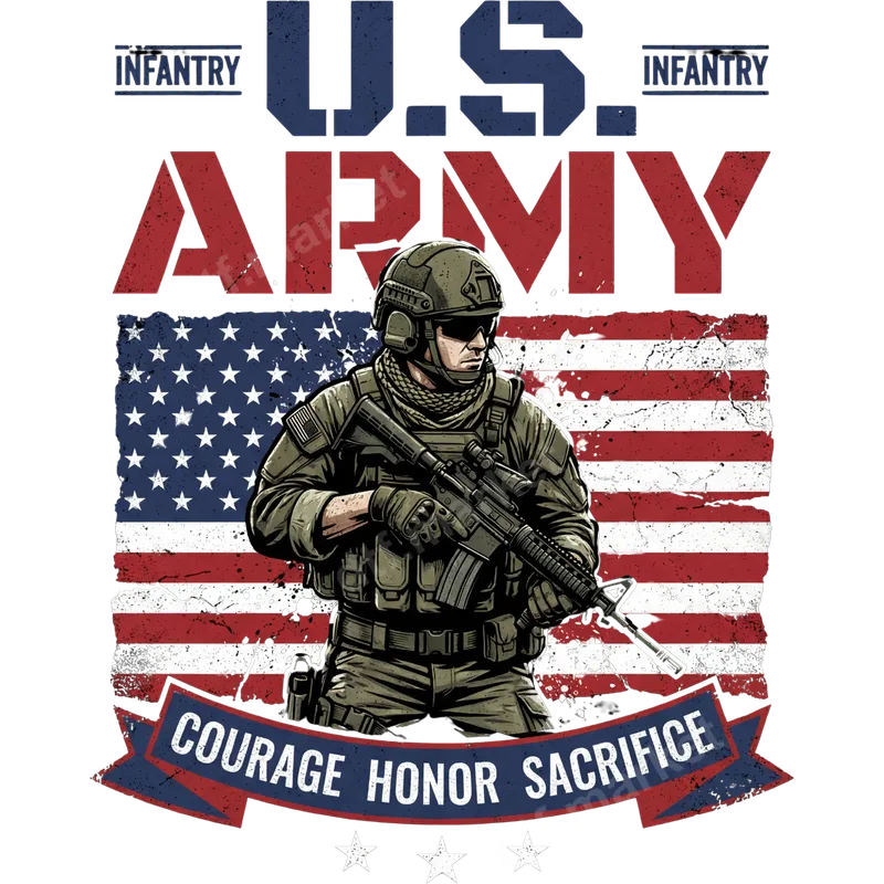 See allDisplay your unwavering support with this striking U.S. Army Infantry soldier DTF transfer. This powerful design features a combat-ready soldier standing resolutely before a distressed American flag, embodying strength and patriotism. Bold text proudly states "U.S. ARMY INFANTRY" and a banner below declares "COURAGE HONOR SACRIFICE," making it a profound statement piece. This high-quality direct to film transfer is ready to press, ensuring a flawless application to your chosen garment. Perfect for active-duty military personnel, proud veterans, and their families, this heat press transfer is an ideal way to honor service and sacrifice. It makes a thoughtful gift for patriotic Americans, especially for occasions like Veterans Day, Memorial Day, Armed Forces Day, or any event celebrating American heroes. Show your pride on shirts, hoodies, or bags, creating custom apparel that speaks volumes. Applying this vibrant design is straightforward. Our ready to press transfers work beautifully on a wide range of materials, including cotton, polyester, and their blends. For best results, use a heat press at 300-325°F for 15 seconds with medium pressure, then peel cold. A household iron can also be used with firm, even pressure. Enjoy the ease of application with no weeding required, delivering a professional finish every time. Crafted with professional-grade DTF film, this heat press ready design promises exceptional durability and vivid colors that stand the test of time. The print is crack-resistant, washable, and incredibly soft to the touch, ensuring comfort and longevity. Elevate your apparel with this premium iron on transfer, designed for lasting impact and a superior feel.