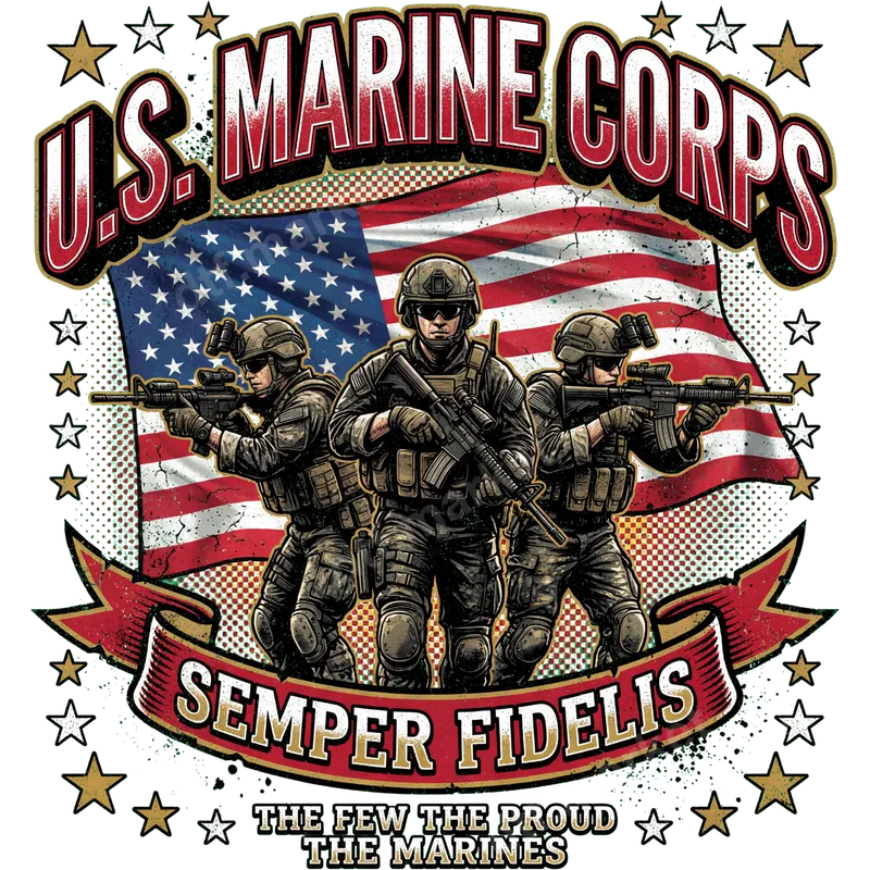 See allThis impactful U.S. Marine Corps DTF transfer features three resolute Marines in full gear against a distressed American flag. "U.S. MARINE CORPS" boldly states identity, while a banner proclaims "SEMPER FIDELIS" and "THE FEW THE PROUD THE MARINES" below. Adorned with patriotic stars, this ready to press design powerfully embodies honor, strength, and unwavering patriotism, perfect for custom apparel. This compelling heat transfer is ideal for active-duty Marines, proud veterans, military families, and anyone showing respect for the U.S. Marine Corps. It's perfect for patriotic holidays like Memorial Day, Veterans Day, or 4th of July, unit reunions, welcome home events, or as a thoughtful gift for service members. Easily create custom shirts or wear your pride daily. Applying this apparel transfer is simple. Our high-quality DTF transfers work on cotton, polyester, and blends. Use a heat press at 300-325°F for 15 seconds with medium pressure for best results; a household iron can also be used. This iron on transfer requires no weeding, making customization fast and effortless. Expect superior quality from this heat press design. Our premium DTF transfers offer vibrant colors, exceptional durability, and resist cracking or peeling, ensuring a lasting look. The finished print is soft to the touch, blending smoothly with fabric. Each professional DTF transfer utilizes strong adhesive, providing a high-quality, long-lasting print.