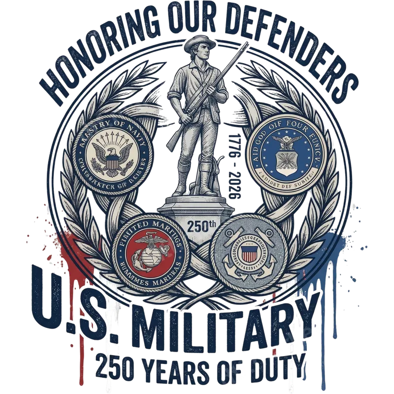 See allThis striking DTF transfer commemorates 250 years of the U.S. Military, boldly declaring "Honoring Our Defenders" and "250 Years of Duty." It features a stoic Revolutionary War militiaman, a laurel wreath, and official seals for the Navy, Air Force, Marines, and Coast Guard, dated 1776-2026. Distressed elements with red and blue paint drips give it a powerful, vintage patriotic appeal. This high-quality, ready to press transfer is perfect for showcasing American pride. This impactful heat transfer design is ideal for active military personnel, veterans, military families, patriotic Americans, and history enthusiasts. It's perfect for Veterans Day, Memorial Day, Fourth of July, Armed Forces Day, or any event celebrating American history and service. It also makes a meaningful gift for those who honor and support our troops, allowing them to proudly display their respect on various apparel items. Applying this heat press transfer is incredibly straightforward, ensuring a professional finish without the need for weeding. It adheres beautifully to cotton, polyester, and cotton-poly blends. For best results, use a heat press at 300-325°F for 15 seconds with medium pressure. It can also be applied with a household iron, making it accessible for everyone looking for an easy iron on transfer. Our DTF transfers are crafted from premium film, offering vibrant, true-to-color results that stand the test of time. They are designed to be crack-resistant and soft to the touch once applied. Each shirt design uses a strong adhesive that bonds securely to your chosen garment, delivering a professional-grade finish that looks fantastic wash after wash. This is truly a heat press ready decal.