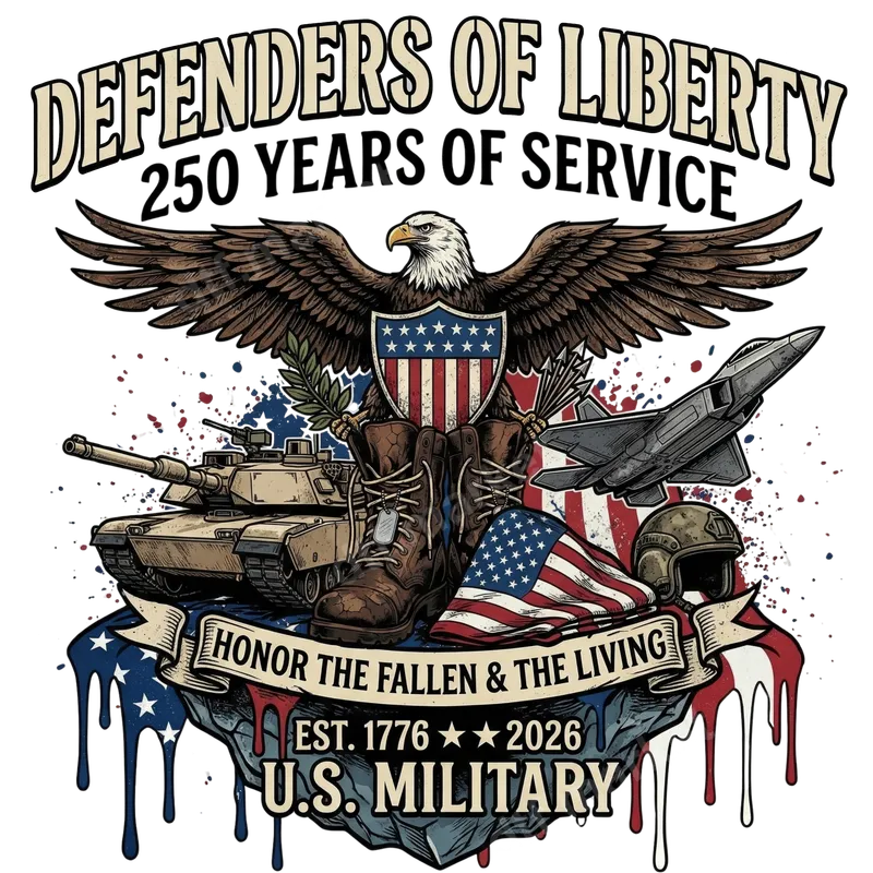 See allThis powerful U.S. Military "Defenders of Liberty" DTF transfer proudly commemorates 250 years of service, from 1776 to 2026. The rich design features a majestic bald eagle, an American flag shield, military boots with dog tags, an olive branch, a tank, and a fighter jet. A waving American flag and helmet rest on a rugged base, framed by patriotic red, white, and blue paint splatters. This ready to press design embodies honor, strength, and unwavering American patriotism. This impactful heat press design is perfect for veterans, active duty personnel, reservists, and their proud families. It’s an ideal way to express gratitude and support for the U.S. Armed Forces. Celebrate Memorial Day, Veterans Day, 4th of July, or Armed Forces Day, or display your pride year-round. It makes a thoughtful gift for any service member or patriotic American. This apparel transfer allows for deep respect and personalized style. Applying this high-quality iron on transfer is straightforward. It’s compatible with 100% cotton, polyester, and cotton-poly blends, offering great versatility. For best results, use a heat press at 300-325°F for 15 seconds with medium, even pressure. Unlike vinyl, there's no weeding required. Simply press and peel to reveal your vibrant, professional garment. A household iron can also be used by following careful application instructions for a durable finish. Experience superior quality with this professional-grade DTF transfer. Crafted with premium film and vibrant, long-lasting inks, this custom transfer ensures exceptional durability. The design is crack-resistant, fade-resistant, and incredibly soft to the touch, ensuring comfort and longevity. Its strong adhesive provides a secure bond to your garment, allowing you to create personalized items that stand up to countless washes. Make a powerful statement of support and patriotism.