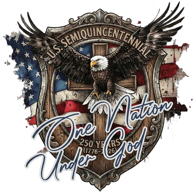 See allThis vibrant U.S. Semiquincentennial DTF transfer proudly commemorates 250 years of American history. It features a majestic bald eagle with outstretched wings, soaring above a rustic wooden shield layered with a distressed American flag. A central wooden cross reinforces the powerful message "One Nation Under God," prominently displayed in elegant script. The design also highlights "250 Years (1776-2026)," marking the upcoming quarter-millennium anniversary of the USA. This high-quality, ready to press design embodies patriotism, faith, and American heritage. This impactful heat transfer is perfect for anyone who cherishes American values, faith, and history. Ideal for patriotic events like the 4th of July, Memorial Day, Veterans Day, or everyday wear to express national pride. It makes a thoughtful gift for veterans, service members, history enthusiasts, or anyone celebrating America's 250th anniversary in 2026. Showcase your spirit and devotion with this unique apparel transfer. Applying this design is simple and versatile. Our durable heat press design works flawlessly on a wide range of fabrics, including cotton, polyester, and various blends. For professional results, use a heat press at 300-325°F for 15 seconds with medium pressure, then peel cold. For home application, a household iron can also be used with careful, even pressure. Enjoy the convenience of a ready to press transfer with absolutely no weeding required, making your customization project quick and easy. Experience superior quality with this premium DTF transfer. Crafted using professional-grade DTF film, our designs are known for their vibrant, true-to-life colors and exceptional detail. The transfers are incredibly durable, crack-resistant, and designed to withstand countless washes without fading or peeling. You'll appreciate the soft, smooth feel of the finished product, which integrates seamlessly into the fabric, providing a professional, long-lasting garment.