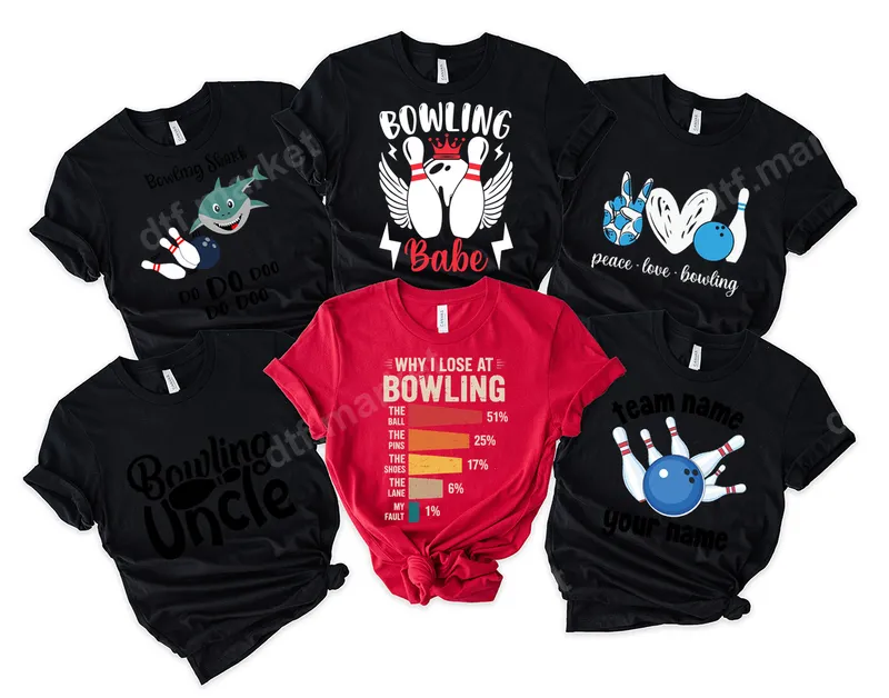 See allThese vibrant DTF transfers bring the fun of bowling directly to your apparel. This collection features a range of ready to press designs, from humorous bar charts explaining "Why I Lose at Bowling" to playful "Bowling Shark" graphics for kids and adults. Celebrate your love for the lane with "Peace Love Bowling" or show team spirit with a customizable bowling ball and pins shirt design. Each high-quality DTF transfer adds personality to any garment. Ideal for bowling enthusiasts, league members, family bowling night participants, and anyone looking for a unique gift for a bowler. These iron on transfers are perfect for creating custom team uniforms, matching family shirts for a birthday party at the alley, or a funny statement piece for casual wear. They make fantastic gifts for Father's Day, Mother's Day, birthdays, or end-of-season bowling banquets. Applying these heat press transfers is quick and easy. Use a heat press set between 300-325°F for 15 seconds with medium pressure, or apply with a household iron. Our direct to film transfers adhere beautifully to 100% cotton, polyester, and cotton-poly blends. Unlike traditional vinyl transfers, there's no weeding required, saving you time and effort. Experience superior quality with our professional-grade DTF film. These apparel transfers boast vibrant colors, exceptional detail, and a soft-hand feel that becomes part of the fabric. Designed for durability, they are crack-resistant, peel-resistant, and machine washable, ensuring your custom shirt design lasts wash after wash. Create professional-looking custom garments with ease using our premium heat press designs.