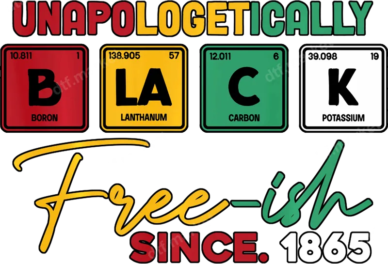 See allEmbrace a powerful statement of heritage and resilience with our "Unapologetically Black Free-ish Since 1865" DTF transfer. This vibrant design features the word "BLACK" creatively spelled out using periodic table elements (Boron, Lanthanum, Carbon, Potassium) in a nod to Pan-African colors, crowned by "UNAPOLOGETICALLY" and underscored by a bold "Free-ish SINCE. 1865." It's a striking and meaningful ready to press transfer for anyone proud of their history. This powerful heat press transfer is perfect for celebrating Juneteenth, Black History Month, or simply expressing your identity year-round. It makes an impactful gift for family, friends, or anyone passionate about civil rights and cultural pride. Stand tall and showcase your unwavering spirit with this unique apparel transfer. Applying this heat press ready design is effortless. Our DTF transfers work beautifully on a wide range of materials, including cotton, polyester, and various fabric blends. Simply use a heat press at 300-325°F for 15 seconds with medium pressure, or apply with a household iron. There's no weeding required, making it a quick and easy way to customize your garments. Experience professional-grade quality with every iron on decal. Our DTF transfers are known for their vibrant colors, exceptional durability, and resistance to cracking and fading. The finished product feels incredibly soft to the touch, ensuring comfort while making a bold statement. Elevate your wardrobe with a design that truly stands out.