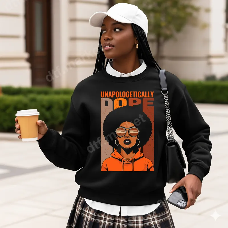 See allShowcase your confidence and pride with our 'Unapologetically Dope' DTF transfer. This vibrant design features a stylish Black woman with a majestic afro, cool sunglasses, and bold hoop earrings, set against a retro-inspired striped background. The powerful phrase 'UNAPOLOGETICALLY DOPE' is emblazoned above, making a clear statement. It's a perfect ready to press graphic for adding a touch of empowerment and unique style to any garment, celebrating individuality and strength. This compelling design is ideal for anyone who wants to express their self-assured personality and unique identity. It's a fantastic choice for women who embrace their natural beauty and strong spirit. Perfect for personalizing apparel for everyday wear, gifting to a friend or family member who embodies this message, or for special events celebrating culture and confidence. This versatile heat transfer makes a statement wherever it goes. Applying this beautiful iron on transfer is incredibly simple. It adheres flawlessly to a wide range of fabrics, including cotton, polyester, and most blends. For best results, use a heat press at 300-325°F for 15 seconds with medium pressure. Even if you don't have a heat press, a household iron can be used with care. The best part? There's no complex weeding or layering required, making customization quick and easy for your next t-shirt transfer project. Our premium DTF transfers are crafted using high-quality ink and professional-grade film, ensuring exceptional durability and vivid colors that pop. Enjoy a soft-to-touch finish that won't crack, peel, or fade over time, maintaining its vibrant appeal wash after wash. The strong adhesive ensures your design stays put, providing a long-lasting, professional look on any apparel. Elevate your wardrobe with a durable and stunning heat press design.