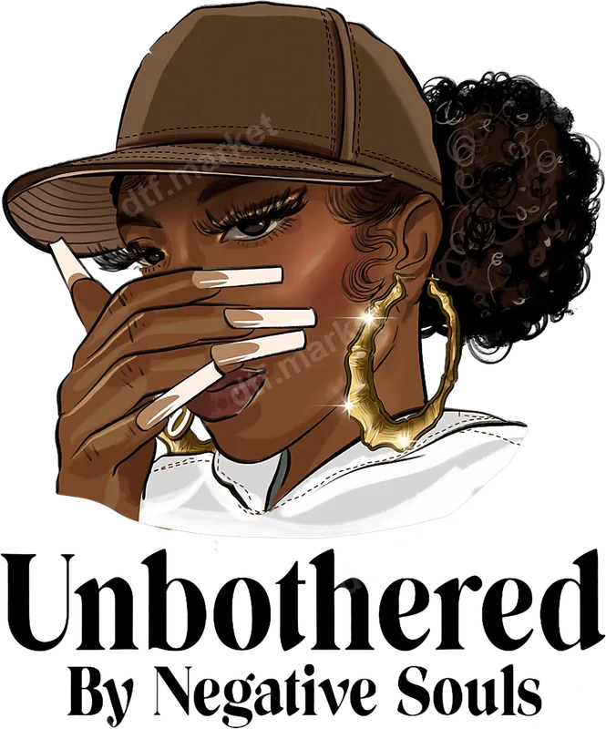 See allThis empowering DTF transfer features a stylish illustration of a confident woman adorned with a cap, statement bamboo earrings, and long nails, embodying an 'unbothered' spirit. The bold text "Unbothered By Negative Souls" perfectly complements the assertive visual, making this a powerful statement piece. This ready to press design brings a vibrant, modern vibe to any garment, allowing you to express your true self without compromise. Ideal for anyone who values self-assurance and positivity, this apparel transfer is perfect for women who resonate with hip-hop culture, streetwear fashion, or simply want to dismiss negativity with style. It makes a fantastic gift for friends, sisters, or mothers who embody strength and independence. Spruce up your everyday wardrobe, create custom gifts, or add a powerful message to your crafting projects. Applying this direct to film transfer is straightforward. Simply use a heat press at 300-325°F for 15 seconds with medium pressure for a professional finish. For home crafters, a household iron can also be used following careful instructions. Our heat press designs are incredibly versatile, adhering beautifully to cotton, polyester, and various fabric blends. Enjoy the convenience of no weeding, ensuring a quick and easy application every time. Crafted with premium quality DTF film, this heat transfer offers exceptional vibrancy and durability. The colors are rich and bold, designed to resist cracking and fading even after multiple washes. The finish is soft to the touch, ensuring maximum comfort when worn. Experience professional-grade results with every iron on transfer from dtf.market, transforming ordinary garments into personalized masterpieces.
