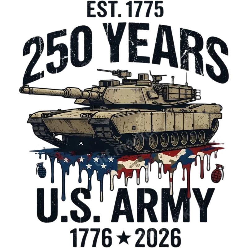 See allCelebrate the enduring legacy of the United States Army with this powerful DTF transfer. The design features a formidable tank, an M1 Abrams, positioned above a distressed American flag graphic that appears to be dripping, flanked by two grenades. Bold text proudly states "EST. 1775," "250 YEARS," "U.S. ARMY," and "1776 ★ 2026," commemorating two and a half centuries of valor. This high-quality DTF transfer is ready to press, offering a vibrant and durable addition to any garment. This patriotic heat transfer is ideal for active US Army personnel, veterans, military families, and anyone who wants to display their unwavering support for the armed forces. It's perfect for occasions like Veterans Day, Memorial Day, the 4th of July, Armed Forces Day, or simply as everyday wear to honor service and sacrifice. This design also makes a thoughtful gift for military enthusiasts and history buffs, allowing them to create custom apparel. Applying this apparel transfer is straightforward. It works seamlessly with a heat press at 300-325°F for 15 seconds with medium pressure, suitable for various materials including cotton, polyester, and blends. For home crafters, it can also be used as an iron on transfer with proper care. There's no need for tedious weeding or layering, making your customization process quick and efficient, whether you're creating a single item or a batch of custom shirts. Our DTF transfers are known for their exceptional quality, delivering vibrant colors, crisp details, and superior durability. The finished design is crack-resistant, peel-resistant, and features a soft, flexible feel that moves with the fabric. This professional-grade heat press ready design ensures your custom apparel not only looks fantastic but also stands the test of time, proudly showcasing your respect for the U.S. Army.