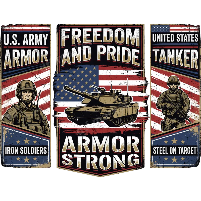 See allShow your unwavering support and patriotism with this striking US Army Armor Tanker DTF transfer. This design features three distinct, distressed panels, each honoring the strength and pride of the American military. The center panel showcases an imposing M1 Abrams-like tank with the powerful slogan "FREEDOM AND PRIDE" and "ARMOR STRONG," all set against a rugged, distressed American flag background. Flanking panels depict resolute soldiers, with text like "U.S. ARMY ARMOR," "IRON SOLDIERS," "UNITED STATES TANKER," and "STEEL ON TARGET." This ready to press DTF transfer is perfect for creating impactful apparel. This powerful heat transfer is ideal for military veterans, active duty service members, military families, and any proud American who wants to display their support for the armed forces. It's an excellent choice for crafting custom garments for patriotic holidays such as Memorial Day, Veterans Day, or the 4th of July, as well as for military appreciation events or as a thoughtful gift for a soldier or veteran. Let your clothing speak volumes about your pride and respect. Applying this durable heat press transfer is incredibly simple. Designed for versatility, it adheres beautifully to a wide range of fabrics including cotton, polyester, and various blends. Achieve professional-quality results with a heat press set between 300-325°F for just 15 seconds with medium pressure, or use a standard household iron following similar guidelines. Forget tedious weeding; this premium iron on decal is ready to apply straight from the film, saving you time and effort. Experience the superior quality of our DTF transfers. Each apparel transfer boasts incredibly vibrant colors that pop, ensuring your design stands out. Engineered to be crack-resistant and offer a soft hand feel, your customized garments will be comfortable and long-lasting. Made with professional-grade DTF film and strong adhesive, this design provides exceptional durability, allowing you to create high-quality, professional-looking apparel that truly endures.