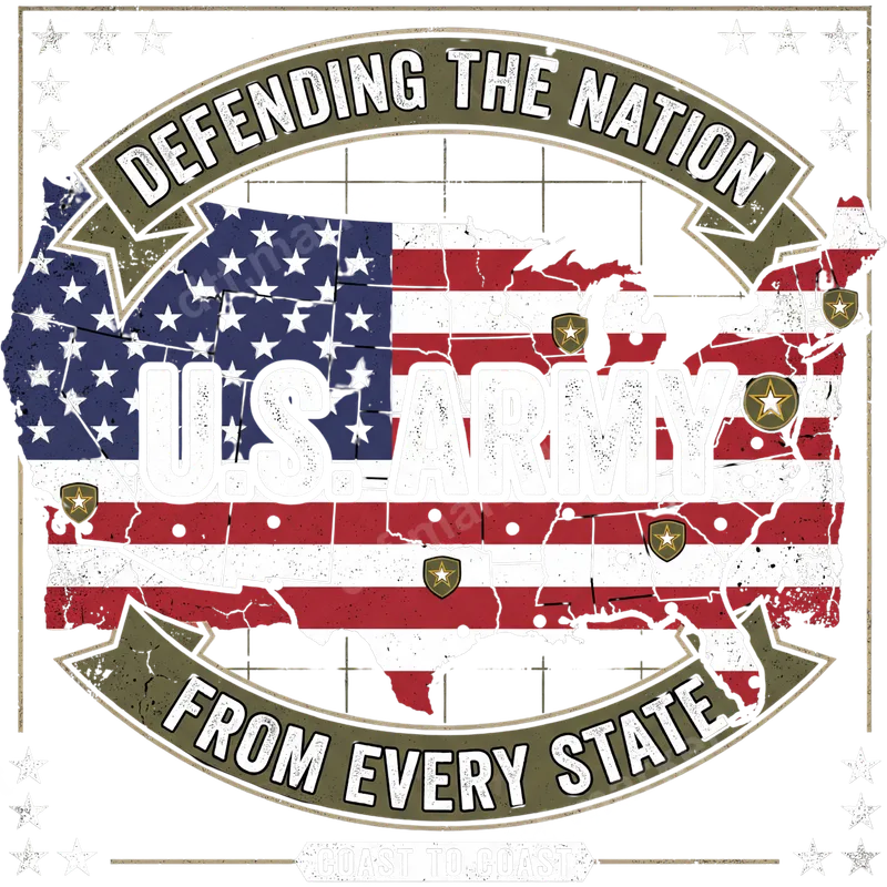 See allThis powerful DTF transfer proudly displays a distressed map of the United States, intricately designed with the American flag, boldly overlaid with "U.S. ARMY." Encircling the map are banners declaring "DEFENDING THE NATION" and "FROM EVERY STATE," with "COAST TO COAST" at the base, punctuated by military star emblems. This ready to press design exudes a strong patriotic and vintage vibe, honoring the commitment of our armed forces. Perfect for veterans, active military personnel, and their families, this heat press transfer is an ideal way to show your unwavering support and national pride. It’s a thoughtful gift for occasions like Veterans Day, Memorial Day, the 4th of July, military appreciation events, or even deployment homecomings. Anyone who cherishes American freedom and respects the US Army will appreciate this meaningful apparel transfer. Applying this high-quality iron on transfer is straightforward and hassle-free, making it perfect for custom t-shirt projects. It's designed for use on a wide variety of fabrics, including cotton, polyester, and their blends. Simply use a heat press at 300-325°F for 15 seconds with medium pressure, or a standard household iron for excellent results. Best of all, there's no weeding required, so your heat press design is ready to go straight from the package to your garment. Our direct to film transfer ensures a vibrant, long-lasting finish that resists cracking and peeling, even after multiple washes. The professional-grade DTF film provides a soft, flexible feel on your fabric, unlike traditional vinyl. With strong adhesive properties, this ready to press transfer will securely bond to your chosen apparel, ensuring your patriotic statement endures.
