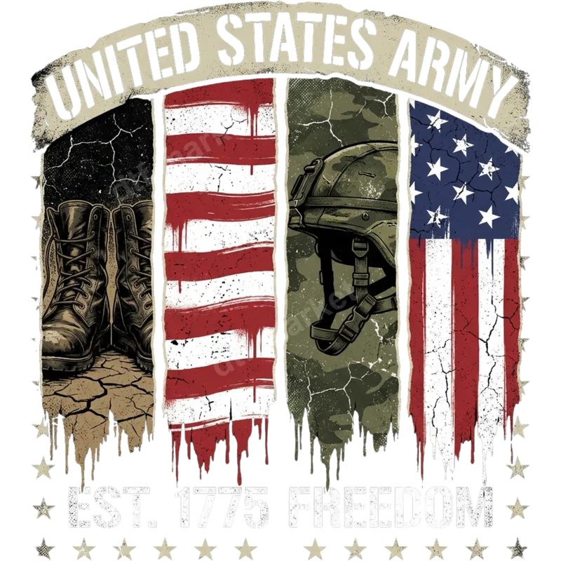 See allThis powerful DTF transfer proudly displays "UNITED STATES ARMY" in a distressed banner, evoking a strong sense of patriotism and military honor. The design features a stylized American flag divided into three weathered panels: one with rugged military boots, another with classic red stripes, and a third with a combat helmet set against a camouflage backdrop and blue starry field. This ready to press transfer is perfect for creating impactful apparel. This striking design is ideal for active military personnel, veterans, their families, and proud patriots who want to honor the US Army. It's perfect for patriotic holidays like the 4th of July, Memorial Day, and Veterans Day, or as a thoughtful gift for birthdays and family reunions. Use this versatile heat press transfer to customize gifts for fathers, grandfathers, brothers, or anyone with a deep connection to military service. Applying this iron on transfer is straightforward and hassle-free, designed for both professional heat press users and home crafters. It adheres beautifully to a wide range of fabrics including cotton, polyester, and various blends, making it a versatile apparel transfer. Simply press at 300-325°F for 15 seconds with medium pressure. No complicated weeding is required, saving you time and effort. Crafted with professional-grade DTF film, this heat transfer ensures vibrant colors, exceptional durability, and a soft, comfortable feel on any garment. The high-quality ink prevents cracking and fading, ensuring your design remains striking wash after wash. Our ready to press transfers boast a strong adhesive that guarantees a lasting bond, creating custom shirts and accessories that stand the test of time.