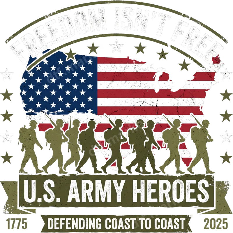 See allHonor the brave with this powerful US Army Heroes DTF transfer, featuring a distressed American flag map of the USA, framed by marching soldier silhouettes. The iconic phrases "FREEDOM ISN'T FREE" and "U.S. ARMY HEROES DEFENDING COAST TO COAST" (from 1775 to 2025) complete this striking design, making it a perfect ready to press statement of patriotism and respect. This military-themed heat press transfer is ideal for veterans, active duty military personnel, their families, and any proud American who wants to show support for the U.S. Army. It's a thoughtful gift for Veterans Day, Memorial Day, the 4th of July, or any day you want to express gratitude for our nation's defenders. Easily customize t-shirts, sweatshirts, and other apparel for everyday wear or special patriotic events. Applying this iron on transfer is simple with a heat press, requiring just 300-325°F for 15 seconds at medium pressure, or can be carefully applied with a household iron. Our direct to film transfer technology ensures a clean, vibrant application with no weeding or intricate steps needed. It works beautifully on a wide variety of fabric types, including cotton, polyester, and their blends. Experience professional-grade quality with this apparel transfer. Our DTF film delivers designs that are incredibly vibrant, soft to the touch, and highly resistant to cracking or fading even after multiple washes. You'll receive a durable, high-quality t-shirt transfer that stands out and proudly displays your tribute to American heroes.