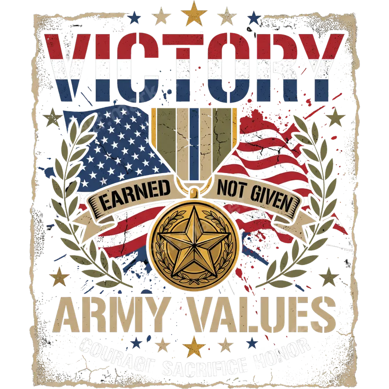 See allThis powerful patriotic DTF transfer showcases a distressed American flag backdrop with a prominent military medal. The design boldly declares "VICTORY EARNED NOT GIVEN" and "ARMY VALUES," underscored by "COURAGE SACRIFICE HONOR." The vintage, grunge aesthetic adds depth and character. It’s a vibrant, ready to press transfer that beautifully captures the essence of military dedication and national pride, perfect for creating impactful apparel. This heat press design is ideal for active military personnel, proud veterans, military families, and any patriotic American who appreciates the sacrifices made for freedom. It’s perfect for Veterans Day, Memorial Day, the 4th of July, or showing everyday support for our troops. Create meaningful gifts for Army enlistees, retirees, or a powerful statement piece for community events. This iron on transfer makes a profound statement. Our direct to film transfer technology ensures effortless application. Compatible with cotton, polyester, and all fabric blends, this design is incredibly versatile. For best results, apply with a heat press at 300-325°F for 15 seconds with medium pressure, then cold peel. For smaller projects or home crafters, a household iron can also be used. Enjoy the convenience of a no-weeding transfer, saving you time and effort. Experience superior quality with our premium DTF transfers. Each design boasts incredibly vibrant colors and sharp details, ensuring your finished product looks professional and eye-catching. Our durable DTF film provides excellent stretch and crack resistance, maintaining its integrity wash after wash. The soft-touch finish means your apparel remains comfortable, while the strong adhesive guarantees a long-lasting bond to your chosen garment. This apparel transfer delivers lasting impact.
