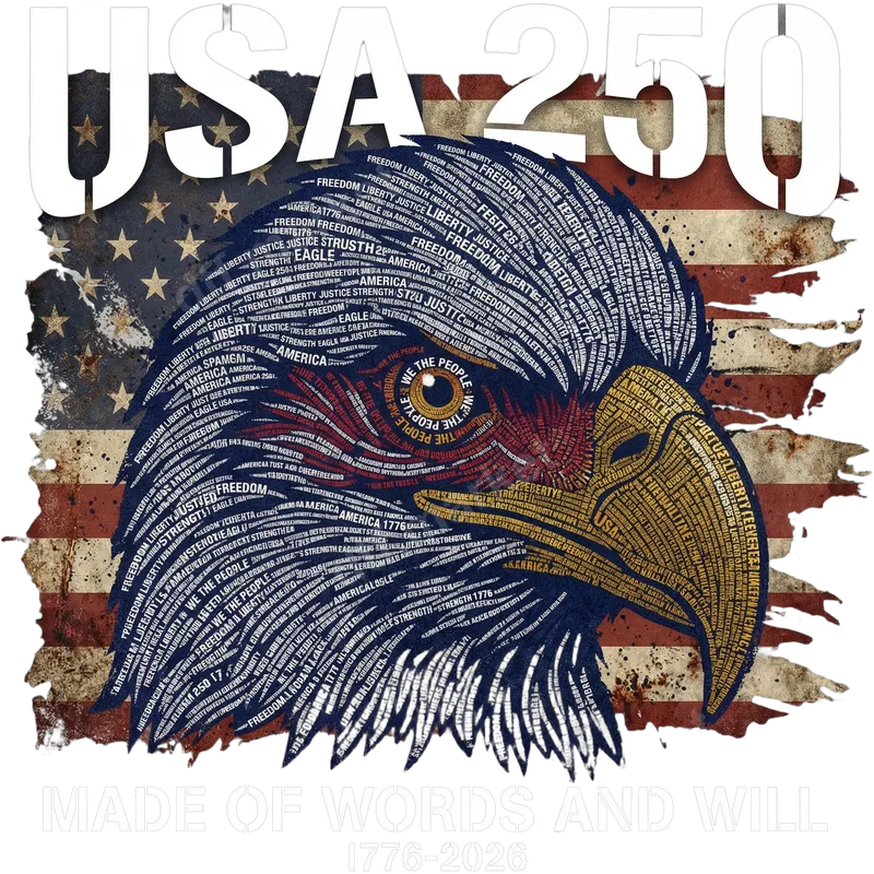 See allThis stunning DTF transfer features a majestic bald eagle, crafted entirely from patriotic words like "Freedom," "Liberty," "Justice," and "America." Above the eagle, "USA 250" stands prominently against a distressed American flag backdrop, with "MADE OF WORDS AND WILL. 1776-2026" elegantly placed below. This powerful design is a ready to press tribute to the nation's 250th anniversary, embodying strength, history, and unwavering American spirit. It's the perfect statement piece for anyone proud of their country. This unique heat press transfer is ideal for patriots, veterans, history enthusiasts, and anyone looking to celebrate national pride. It makes an excellent gift for significant patriotic holidays like the 4th of July, Memorial Day, or Veterans Day, and is especially fitting for events leading up to the USA's Semiquincentennial in 2026. Create custom apparel for family gatherings, community events, or simply to show your love for the USA. Applying this apparel transfer is incredibly easy with a heat press. It adheres beautifully to a wide range of materials including cotton, polyester, and various blends. For best results, press at 300-325°F for 15 seconds with medium pressure. Unlike traditional vinyl transfers, there's no weeding required, saving you time and effort. Simply press, peel, and admire your professional-quality shirt design. Our direct to film transfers are known for their exceptional quality. They boast vibrant colors, superior stretch, and crack-resistant durability, ensuring your design looks fantastic wash after wash. The soft-to-touch finish ensures maximum comfort, while the strong adhesive guarantees a long-lasting bond to your chosen garment. Trust dtf.market for premium heat transfer designs that stand the test of time.