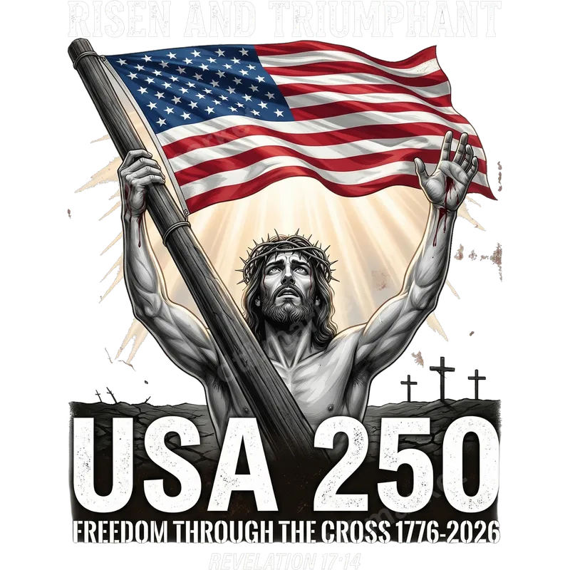 See allThis powerful DTF transfer depicts a risen Christ, crown of thorns, and bleeding hands, holding a pole from which the American flag proudly waves. Beaming light emanates from behind Jesus, creating a striking and inspirational visual. Below, the bold text "USA 250" marks the upcoming 250th anniversary of American independence (1776-2026), accompanied by "FREEDOM THROUGH THE CROSS" and "REVELATION 17:14." This ready to press design beautifully merges themes of faith and patriotism, making a profound statement. This design is ideal for devout Christians, proud Americans, and anyone who cherishes the intersection of faith and country. It's perfect for celebrating Independence Day, church events, patriotic holidays, or as a meaningful gift for family and friends. Use this powerful iron on transfer to create custom apparel for veterans, active military, or for commemorating significant historical anniversaries like the USA's Semiquincentennial. This unique graphic appeals to those seeking to express their spiritual beliefs and national pride simultaneously. Our high-quality heat press transfer is incredibly versatile and easy to apply. It works flawlessly on a wide range of materials, including 100% cotton, polyester, and various fabric blends. For best results, we recommend using a heat press at 300-325°F for 15 seconds with medium pressure, followed by a cool peel. While a heat press is ideal, many customers also achieve great results with a household iron. Forget the hassle of weeding vinyl transfers; these direct to film transfers are ready to go straight from the film to your garment. Experience superior quality with our professional-grade DTF transfers. Each shirt design boasts vibrant colors, exceptional detail, and a soft, flexible feel that won't crack or peel, even after multiple washes. Crafted using durable DTF film and strong adhesive, these apparel transfers ensure a long-lasting, high-definition finish on any garment. You're investing in a premium, ready to press transfer that stands the test of time and truly makes a statement.