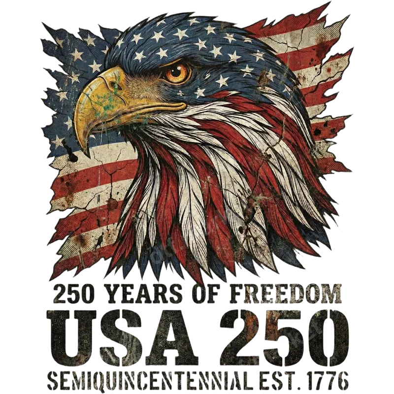 See allCommemorate 250 years of American independence with our bold USA 250 Semiquincentennial DTF transfer. This patriotic design features a majestic bald eagle, its head intricately detailed with the distressed stars and stripes of the American flag. The grunge aesthetic and prominent text '250 YEARS OF FREEDOM USA 250 SEMIQUINCENTENNIAL EST. 1776' make this ready to press transfer a powerful statement of liberty and national pride. Perfect for patriots, history enthusiasts, and anyone celebrating America's enduring spirit, this heat press transfer is ideal for the upcoming 2026 Semiquincentennial celebrations. Create custom apparel for 4th of July, Memorial Day, Veterans Day, or everyday wear. It makes a fantastic gift for veterans, service members, history buffs, or proud Americans looking to show their national spirit. Our premium iron on transfer is designed for easy application on a wide range of materials, including cotton, polyester, and their blends. For best results, use a heat press at 300-325°F for 15 seconds with medium pressure, then peel cold. You can also apply it with a household iron (follow included instructions). Enjoy professional results without the hassle of weeding, making it a quick and convenient way to personalize your garments. Experience superior quality with our direct to film transfer technology. This apparel transfer boasts vibrant, true-to-color graphics that are crack-resistant and incredibly soft to the touch. Manufactured with professional-grade DTF film and strong adhesive, your customized t-shirts, hoodies, or bags will stand up to countless washes, ensuring your patriotic message remains bold and clear for years to come.