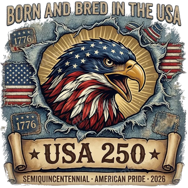 See allShow your unwavering American pride with this striking Born and Bred in the USA DTF transfer, commemorating the upcoming USA 250 Semiquincentennial in 2026. This eye-catching design features a majestic bald eagle, its feathers adorned with stars and stripes, dramatically bursting through a ripped denim background. Complete with rustic '1776' patches and a banner proudly proclaiming 'USA 250,' this ready to press design encapsulates vintage Americana and patriotic spirit, making it a perfect statement piece. This patriotic heat transfer is ideal for anyone who loves their country, including veterans, active military families, history enthusiasts, and proud Americans. It’s perfect for celebrating national holidays like the 4th of July, Memorial Day, Veterans Day, or for everyday wear to express your national loyalty. It also makes a thoughtful gift for dads, grandpas, or friends who embody the American spirit and are looking forward to the 250th anniversary celebrations. Applying this iron on transfer is simple and efficient. It works flawlessly on a wide variety of fabrics including cotton, polyester, and blends. For best results, use a heat press at 300-325°F for 15 seconds with medium pressure, followed by a cold peel. Alternatively, a household iron can be used for smaller projects. Enjoy the convenience of a no-weeding transfer that adheres beautifully to your chosen garment. Crafted with professional-grade DTF film, this t-shirt transfer delivers vibrant colors and crisp details that truly stand out. Our apparel transfers are designed for durability, offering excellent stretch and crack resistance, ensuring your patriotic design stays flawless wash after wash. The soft-touch finish integrates seamlessly with fabric, providing a comfortable and long-lasting customized look.