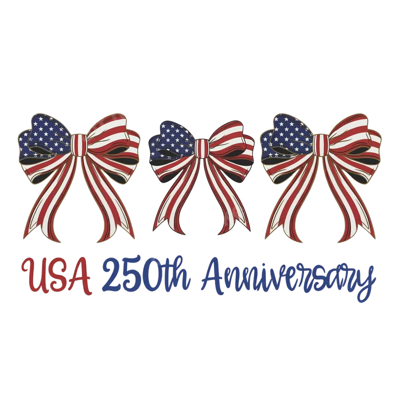 See allCommemorate a momentous occasion with our exclusive USA 250th Anniversary Patriotic Bows DTF transfer. This vibrant design features three beautifully rendered bows adorned with the classic American flag pattern of stars and stripes, alongside elegant "USA 250th Anniversary" script in red and blue. It's a perfect ready to press transfer to show your American pride and celebrate a quarter-millennium of nationhood with classic charm. This versatile heat transfer is ideal for patriots, history enthusiasts, event organizers, and anyone celebrating the United States' sestercentennial. Perfect for Fourth of July gatherings, Memorial Day events, Veterans Day tributes, historical celebrations, or simply expressing national pride year-round. It makes a fantastic gift for family, friends, or community members involved in anniversary festivities and parades. Create unique apparel for historical reenactments or personal statements. Our premium direct to film transfer can be easily applied to a wide range of fabrics, including cotton, polyester, and various blends, making it incredibly versatile. For best results, use a heat press at 300-325°F for 15 seconds with medium pressure, then perform a cold peel. A household iron can also be used with careful application. Enjoy the convenience of a detailed design without any tedious weeding or layering, saving you time and effort. Experience professional-grade quality with this durable iron on transfer. The colors are incredibly vibrant and remain crack-resistant and soft to the touch, ensuring your custom garment looks great wash after wash. Crafted using professional DTF film with strong adhesive, this design offers excellent stretchability and longevity, maintaining its integrity even with frequent wear. Elevate your apparel with a transfer designed to last.