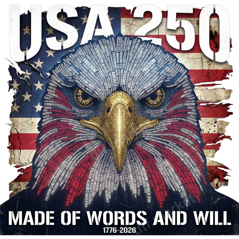 See allThis powerful DTF transfer celebrates the USA 250th anniversary (1776-2026) with a striking patriotic eagle design. The majestic bald eagle is intricately formed from a mosaic of words like "FREEDOM," "LIBERTY," and "WE THE PEOPLE," rendered in American flag colors against a distressed flag backdrop. The bold "USA 250" and "MADE OF WORDS AND WILL" complete this ready to press design, making it a profound statement of national pride. This unique heat transfer is perfect for patriots, veterans, and history buffs. It's an ideal choice for Fourth of July, Memorial Day, Veterans Day, or any event commemorating American independence. Use it to create meaningful gifts for family and friends, or craft custom apparel for rallies and parades. Show your unwavering pride in the USA with this timeless design. Applying this custom transfer is simple and efficient. Our high-quality iron on decal works flawlessly on cotton, polyester, and various blends. For best results, use a heat press at 300-325°F for 15 seconds with medium pressure. It can also be applied with a household iron with firm, even pressure. No weeding or layering needed, just a smooth, professional application. Experience superior quality with this direct to film transfer. Our designs boast vibrant, true-to-color inks that resist cracking, peeling, and fading, ensuring your creation looks fantastic wash after wash. Printed on professional-grade DTF film with strong adhesive, this heat press design offers exceptional durability and a soft, comfortable feel on any garment.
