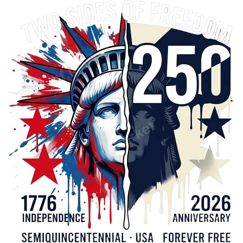 See allThis impactful DTF transfer commemorates the USA's 250th Semiquincentennial, marking independence from 1776 to 2026. Featuring Lady Liberty split into vibrant patriotic colors and a more somber, reflective tone, it's titled "Two Sides of Freedom." This ready to press design combines artistic flair with deep historical significance, perfect for showcasing national pride with a modern edge. This design is ideal for proud Americans, history enthusiasts, and anyone celebrating the nation's journey. It's perfect for Fourth of July gatherings, Memorial Day, Veterans Day, historical events, or as a meaningful gift for family and friends. Create custom apparel for patriotic parades, historical society events, or simply to express your enduring love for the USA. Applying this vibrant heat press transfer is straightforward for both professionals and DIY crafters. It works beautifully on a wide range of fabrics including cotton, polyester, and their blends. Simply apply with a heat press at 300-325°F for 15 seconds with medium pressure, then peel cold. No weeding is required, making your apparel transfer projects quick and hassle-free. Our DTF transfers are known for their exceptional quality, delivering bright, long-lasting colors and a soft-to-the-touch feel that resists cracking and peeling. Each iron on transfer is printed on professional-grade DTF film with a strong, reliable adhesive, ensuring your custom shirt design remains vibrant and durable through countless washes.