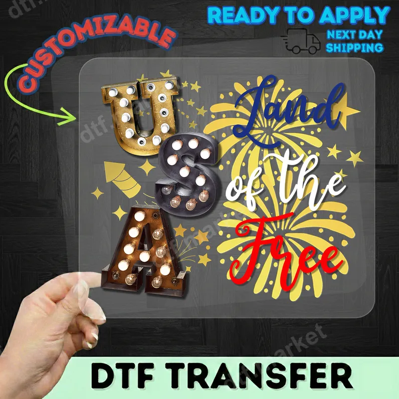 See allThis eye-catching DTF transfer celebrates American pride with a bold "USA" rendered in vintage marquee light-up letters, complemented by the inspiring phrase "Land of the Free." Vibrant fireworks bursts and sparkling stars fill the background, creating a festive and patriotic feel. This high-quality direct to film transfer is ready to press, making it simple to create stunning custom apparel. The mix of classic lettering and dynamic celebration elements makes it perfect for showcasing your love for the USA. Ideal for Independence Day celebrations, Memorial Day events, or any occasion demanding a display of national pride. This versatile heat transfer makes an excellent gift for veterans, military families, or anyone passionate about their American heritage. Personalize shirts for family reunions, parade wear, or everyday patriotic style. It's perfect for crafters looking to add unique, spirited designs to their product lines or for individuals making a statement. Applying this design is effortless. Our ready to press transfer works beautifully on a wide variety of materials, including cotton, polyester, and their blends. For best results, use a heat press at 300-325°F for 15 seconds with medium pressure, then peel cold. If you don't have a heat press, a household iron can also be used with careful application. Enjoy the convenience of a professional iron on transfer with no weeding or layering required. Experience superior quality with our durable DTF transfers. Each design boasts vibrant, true-to-color inks that are crack-resistant and soft to the touch, ensuring your apparel remains comfortable and looks fantastic wash after wash. We use professional-grade DTF film with a strong, reliable adhesive for a long-lasting finish. Elevate your garments with a custom transfer that feels as good as it looks, offering a premium finish every time.
