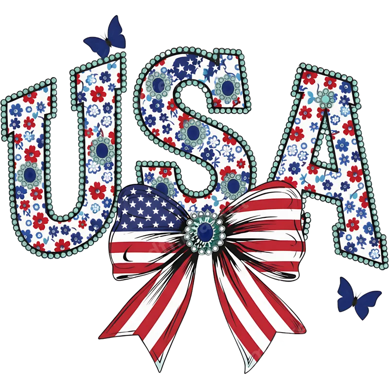 See allThis charming "USA" DTF transfer showcases a unique blend of patriotism and floral elegance. The letters are intricately filled with beautiful red, white, and blue flowers, accented by a delicate beaded outline. A prominent American flag bow with a sparkling jewel sits beneath, flanked by graceful blue butterflies, creating a truly eye-catching and ready to press design perfect for celebrating national pride with a touch of feminine charm. Ideal for patriotic Americans, veterans, military families, and anyone who loves to display their national spirit, this design is perfect for events like the 4th of July, Memorial Day, Labor Day, or simply for everyday wear. It makes an excellent gift for teachers, friends, or family members, and is a fantastic choice for crafters looking to create unique apparel or merchandise. This versatile heat transfer is sure to be a favorite. Our direct to film transfer is compatible with a wide range of materials, including cotton, polyester, and various blends, ensuring vibrant results on almost any garment. Application is simple: use a heat press at 300-325°F for 15 seconds with medium pressure, then peel hot or warm for best results. For those without a professional heat press, a household iron can also be used with firm, even pressure. Best of all, there's no tedious weeding required, making your crafting process quick and enjoyable. This heat press ready design simplifies custom apparel creation. Crafted with premium DTF film and inks, this professional-grade DTF transfer boasts incredibly vibrant colors that remain crisp and clear wash after wash. The design is engineered to be crack-resistant and offers a soft, lightweight feel on your fabric, ensuring comfort and durability. Experience the quality of a superior iron on transfer that adheres strongly and lasts.