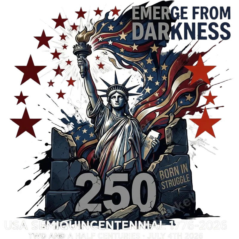 See allCommemorate a monumental milestone with our striking Semiquincentennial DTF transfer, celebrating 250 years of American independence. This patriotic design features the iconic Statue of Liberty holding her torch aloft, set against a dynamic waving American flag, encircled by stars, and emerging from a cracked stone foundation. Bold text proclaims "EMERGE FROM DARKNESS" and "BORN IN STRUGGLE," with a prominent "250" signifying the USA's Semiquincentennial from 1776-2026. This ready to press design encapsulates the enduring spirit and resilience of the nation. This powerful heat transfer is perfect for patriots, history enthusiasts, veterans, and anyone proud of American heritage. It makes an excellent statement piece for Fourth of July celebrations, Memorial Day, Veterans Day, civic events, or as a thoughtful gift for those who cherish freedom and national pride. Create custom apparel that honors the struggles and triumphs of the United States as it approaches its 250th anniversary. Our premium DTF transfers are designed for easy application with a heat press, adhering flawlessly to a wide range of fabrics including cotton, polyester, and blends. For best results, press at 300-325°F for 15 seconds with medium pressure. These transfers are also suitable for application with a quality household iron, offering versatility for all crafters. Enjoy the convenience of a detailed, professional t-shirt transfer with no weeding required, saving you time and effort. Experience exceptional quality with vibrant, full-color reproduction that resists cracking and peeling, ensuring your design lasts for years. Each iron on transfer boasts a soft hand feel and strong adhesive backing, providing a durable and comfortable finish on any garment. Bring your custom projects to life with a transfer that truly stands out and makes a powerful patriotic statement.