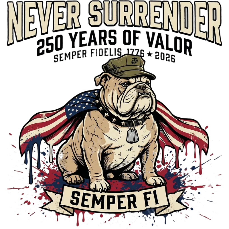 See allShow your unwavering patriotism and Marine Corps pride with this powerful USMC Bulldog DTF transfer. Featuring a stern bulldog mascot adorned in a Marine Corps cover and an American flag cape, this ready to press design proudly declares "NEVER SURRENDER" and "SEMPER FI." The distressed red and blue paint splatters add a rugged, battle-hardened aesthetic, commemorating "250 YEARS OF VALOR" from 1776 to 2026. This striking apparel transfer is perfect for active-duty Marines, veterans, military families, and proud patriots. It makes an excellent gift for Veterans Day, Memorial Day, the 4th of July, military graduations, or any occasion to honor service and dedication. Wear it with pride to family gatherings, veteran events, or as an everyday statement of support. Our heat press transfer is incredibly versatile and works flawlessly on a wide range of materials, including 100% cotton, 100% polyester, and various cotton/poly blends. Application is a breeze with a heat press (300-325°F for 15 seconds with medium pressure), or even a household iron for smaller designs. There's no tedious weeding required, making this an easy iron on transfer for professional and DIY users alike. Experience superior quality with this vibrant and durable t-shirt transfer. Crafted using professional-grade DTF film and strong adhesive, our heat press design ensures crack-resistant prints that remain soft to the touch and maintain their brilliant colors wash after wash. Transform your garments and accessories with a lasting tribute to valor and fidelity.