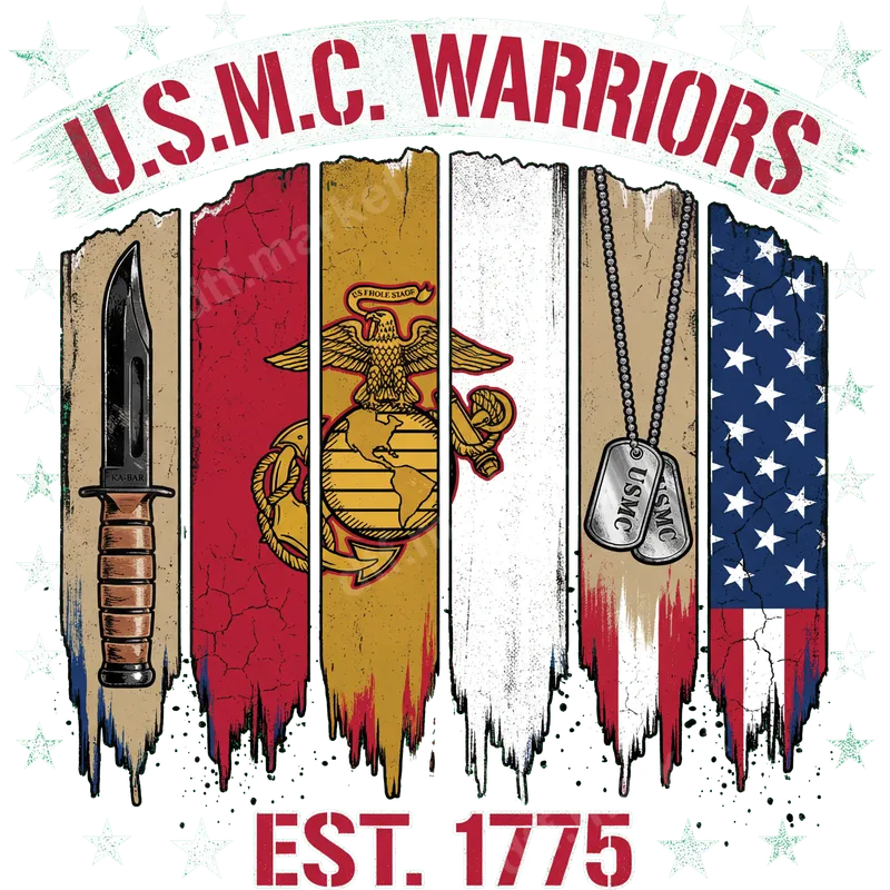 See allThis bold DTF transfer features a powerful 'U.S.M.C. Warriors Est. 1775' design, celebrating the United States Marine Corps. It showcases distressed vertical panels with a Ka-Bar knife, the Eagle, Globe, and Anchor emblem, classic dog tags, and the American flag. This high-quality direct to film transfer is ready to press, perfect for creating custom apparel that honors military service. This military-themed design is perfect for active-duty Marines, veterans, their proud family, and any devoted supporter. It’s an ideal iron on transfer for Memorial Day, Veterans Day, the Marine Corps birthday, patriotic events, or as a thoughtful gift. Easily personalize t-shirts, jackets, bags, or hats to display your unwavering respect and pride. Applying your new heat press transfer is incredibly straightforward. Our ready to press transfers work seamlessly on cotton, polyester, and blends. For best results, use a heat press set between 300-325°F for 15 seconds with medium pressure. This durable heat press design can also be applied with a household iron. Best of all, there’s absolutely no weeding required, saving you time. Experience superior quality with our professional-grade DTF transfers. Each transfer boasts exceptionally vibrant colors and crisp details. Designed for longevity, these apparel transfers are crack-resistant, fade-resistant, and soft to the touch. We use premium DTF film and strong adhesive to guarantee a durable, long-lasting finish that can withstand numerous washes. This custom transfer is a fantastic alternative to traditional vinyl designs.