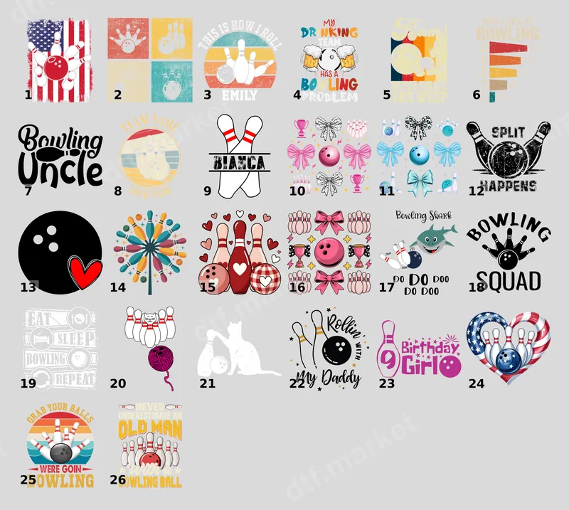 See allThis vibrant DTF transfer features an adorable arrangement of bowling pins, a bowling ball, and playful hearts, some pins adorned with a charming red plaid pattern and others with solid red and white hearts. The design perfectly blends the love of bowling with a sweet, romantic aesthetic, making it an eye-catching statement piece. It’s a ready to press design, meaning it’s pre-printed and prepared for quick application onto your favorite apparel. This cute bowling heat transfer is ideal for bowling enthusiasts, couples who enjoy the sport, or anyone looking to add a touch of love and fun to their wardrobe. It’s perfect for Valentine's Day gifts, anniversary celebrations, bowling league events, date night outfits, or just showing off your passion for the lanes year-round. It also makes a fantastic gift for a significant other who loves to bowl. Our high-quality heat press transfer is incredibly versatile and can be applied to a wide range of fabrics, including cotton, polyester, and various blends. For best results, use a heat press at 300-325°F for 15 seconds with medium pressure, followed by a cool peel. This direct to film transfer can also be applied with a household iron, providing flexibility for all crafters. Forget the hassle of weeding, as these shirt designs are ready to go straight onto your garment. Experience superior quality with our professional-grade DTF transfers. Each iron on transfer is printed with vibrant, long-lasting colors that resist cracking and fading, ensuring your design looks fresh wash after wash. The soft, flexible feel of the transfer provides maximum comfort without a heavy, stiff texture. Made with durable DTF film and a strong adhesive, these apparel transfers offer excellent stretch and durability for any garment.