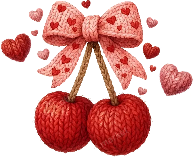 Valentine's Knitted Cherry Hearts Bow DTF Transfer