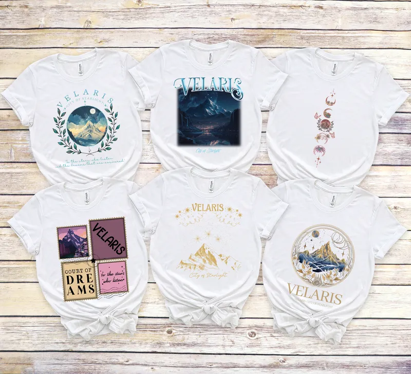 See allEmbrace the magic of Prythian with our captivating Velaris DTF transfer, inspired by the beloved A Court of Thorns and Roses series. This ready to press design showcases the ethereal City of Starlight, featuring majestic mountains, twinkling celestial elements, and iconic phrases. Each direct to film transfer captures the enchanting essence of the Night Court, perfect for bringing your favorite bookish aesthetic to life on any garment. This fantasy-themed heat press design is essential for ACOTAR fans, book lovers, and anyone who dreams of Velaris. It's an ideal gift for birthdays, book club events, or to simply create unique fan merchandise. Whether you're attending a convention or just showing off your literary passion, these designs are perfect for crafting custom apparel that truly speaks to your soul. Applying your Velaris design is straightforward. Our high-quality iron on transfers work beautifully on cotton, polyester, and blends. For optimal results, use a heat press at 300-325°F for 15 seconds with medium pressure. A household iron can also be used following detailed instructions. Enjoy the ease of a heat press ready transfer with no weeding required, making your DIY projects simple and rewarding. Experience professional-grade results with every Velaris DTF transfer. Our premium direct to film transfers offer vibrant colors, crack-resistant flexibility, and a soft feel. Crafted with durable DTF film and strong adhesive, these t-shirt transfers are designed for long-lasting wear and countless washes, ensuring your 'City of Starlight' design remains stunning and intact for years.