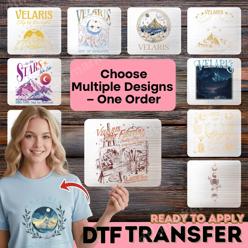 See allStep into the enchanting world of Velaris, the City of Starlight, with this captivating DTF transfer collection. Each design beautifully encapsulates the magical essence of a beloved fantasy realm, featuring majestic mountains, shimmering celestial bodies like moons and stars, and intricate nature-inspired details. These high-quality, ready to press designs are perfect for bringing a touch of Fae magic to your everyday wardrobe. This collection of Velaris-themed designs is a must-have for any devoted fan of A Court of Thorns and Roses (ACOTAR) series and other fantasy literature enthusiasts. Ideal for personalizing gifts, creating unique fan apparel, or expressing your literary passion, these heat transfer designs are perfect for book club gatherings, fan conventions, or adding a magical touch to your daily style. Wear your favorite fantasy world with these exquisite iron on transfers. Applying your Velaris DTF design is incredibly simple, making it a favorite for DIY creators. Our professional-grade t-shirt transfers adhere seamlessly to a wide range of fabrics, including cotton, polyester, and various blends. For best results, use a heat press at 300-325°F for 15 seconds with medium pressure, then cold peel the film. A household iron can also be used with careful application. Forget about tedious weeding; these designs are ready to be pressed right out of the package. Experience superior quality with our durable and vibrant apparel transfer designs. Each Velaris print is engineered to be crack-resistant, offering exceptional longevity and washability. Colors remain brilliant, and the finish is soft to the touch, ensuring comfort without stiffness. Made with premium DTF film and strong adhesive, these designs provide a professional-grade look and feel that will make your customized garments stand out, capturing the magic of the City of Starlight.