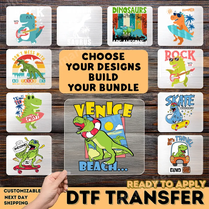 See allDive into summer fun with this vibrant Venice Beach T-Rex DTF transfer. This playful design features a cheerful dinosaur ready for the beach, complete with a swim ring, sandy shores, and sunny skies. It's a perfect ready to press graphic that captures the relaxed, vacation-ready spirit of Venice Beach, bringing a touch of prehistoric charm to modern apparel. The bright colors and whimsical illustration make it an instant eye-catcher, ideal for anyone who loves dinosaurs and beach days. This fun direct to film transfer is perfect for kids and adults who adore dinosaurs, summer, and beach vibes. It's an excellent choice for family vacations, summer camps, birthday gifts, or just adding a unique touch to your everyday wardrobe. Imagine this adorable dino on matching family beach shirts, or as a cool iron on decal for a child's summer outfit. It's also great for small businesses looking for popular summer designs for their custom apparel. Applying this heat press ready design is incredibly easy, making it accessible for both experienced crafters and beginners. Our high-quality heat press transfers work seamlessly on a wide variety of fabrics, including 100% cotton, polyester, and cotton-poly blends. For best results, use a heat press at 300-325°F for 15 seconds with medium pressure. No heat press? A household iron can also be used following specific instructions. The best part? There's no tedious weeding required, so you can go from unboxing to wearing in minutes. Experience superior quality with our professional-grade DTF transfers. Each transfer boasts incredibly vibrant colors that pop, ensuring your designs stand out. Engineered to be crack-resistant and durable, these apparel transfers will withstand countless washes without fading or peeling, maintaining their crisp look. The special DTF film ensures a soft-to-touch feel on the garment, unlike traditional vinyl, and the strong adhesive provides excellent adherence for long-lasting wear. Get ready to create custom shirts and accessories that look professionally made every time.