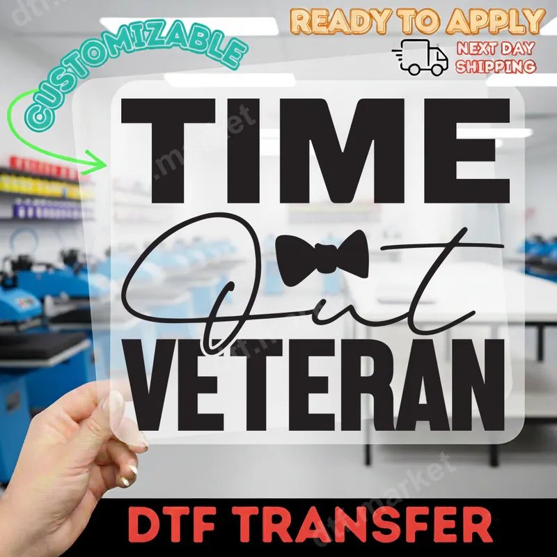 See allCelebrate our heroes with this unique 'TIME Out VETERAN' DTF transfer, featuring a clever bow tie graphic that replaces the 'O' in 'Out'. This design combines a respectful tribute with a touch of lighthearted humor, making it a distinctive choice. This high-quality direct to film transfer is ready to press, ensuring a quick and easy application process for your chosen apparel. This versatile heat transfer is ideal for veterans, military family members, or patriotic individuals looking to express their pride and gratitude. It's a perfect iron on transfer for crafting personalized gifts for Veterans Day, Memorial Day, birthdays, or any day you want to honor service. Create custom shirts for reunions, family gatherings, or casual wear, making a statement with ease. Our heat press design works flawlessly on a wide range of materials, including cotton, polyester, and various fabric blends. For optimal results, apply with a heat press at 300-325°F for 15 seconds with medium pressure. A household iron can also be used with care. The best part? There's absolutely no weeding required, saving you time and effort compared to traditional vinyl transfer methods. Experience superior durability and vibrant colors with this professional-grade apparel transfer. Our DTF film ensures your design remains crack-resistant, peel-resistant, and maintains its vividness wash after wash. The finished product boasts a soft, lightweight feel, making it comfortable to wear. You'll receive a premium ready to press transfer that stands the test of time.