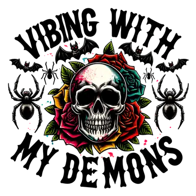 Vibing with My Demons Skull Roses DTF Transfer | Gothic Spiders & Bats Heat Press Ready Design