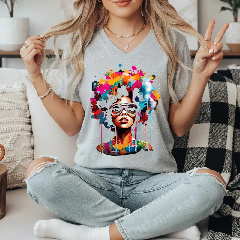 See allThis stunning DTF transfer features a captivating abstract portrait of a woman, bursting with an explosion of vibrant, multi-colored paint splatters. Her stylish white glasses add a modern, edgy touch to this dynamic design, creating a powerful visual statement. This ready to press transfer is perfect for adding an artistic and energetic vibe to any garment. Ideal for art lovers, fashion enthusiasts, and anyone looking to express their unique style, this colorful heat press design is a fantastic choice for personalizing apparel. It makes an excellent gift for birthdays, holidays, or just to celebrate individuality. Perfect for casual wear, music festivals, art events, or simply brightening up your everyday wardrobe. Our premium direct to film transfer is designed for easy application with a heat press, making DIY apparel customization simple and professional. For best results, press at 300-325°F for 15 seconds with medium, even pressure. This durable iron on transfer adheres beautifully to a wide range of fabrics, including cotton, polyester, and their blends, requiring no tedious weeding. Experience professional-grade quality with every apparel transfer. Our DTF prints boast incredibly vibrant colors that pop, superior stretch and crack resistance, and a soft, lightweight feel that integrates seamlessly with your fabric. Each heat press ready design uses high-quality film and strong adhesive, ensuring your custom creation looks fantastic wash after wash.