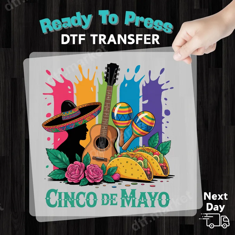 See allThis lively Cinco de Mayo DTF transfer captures the festive spirit of the holiday with a vibrant design. It features a silhouette wearing a classic sombrero, an acoustic guitar, colorful maracas, delicious tacos, and two beautiful pink roses, all set against a fun, paint-splatter background. This direct to film transfer is ready to press onto your favorite garments, bringing an instant pop of color and celebration to any item. Perfect for anyone planning to celebrate Cinco de Mayo, this heat press design is ideal for party-goers, restaurant staff, or those who simply love Mexican culture. It makes a fantastic gift for friends and family, or for creating custom apparel for themed events, backyard BBQs, and cultural festivals. Design custom shirts for your whole group and make a statement at any fiesta. Applying this heat press transfer is simple and versatile. It works wonderfully on various fabric types, including cotton, polyester, and blends. For best results, use a heat press at 300-325°F for 15 seconds with medium pressure, then cold peel. For smaller projects or home use, a household iron can also be used. Forget the hassle of weeding; this iron on decal comes ready to apply, saving you time and effort. Our DTF transfers are crafted for exceptional quality, delivering vibrant colors that pop and a soft, smooth finish that feels great to the touch. The professional DTF film ensures a durable, crack-resistant design that withstands washes and wear. Enjoy a premium t-shirt transfer that maintains its integrity and brightness, making your custom apparel stand out.