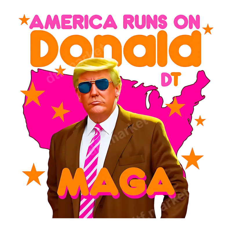 See allDeclare your allegiance with this eye-catching "America Runs On Donald" MAGA DTF transfer. Featuring a cool, sunglasses-clad Donald Trump set against a vibrant pink US map adorned with stars, this design is both bold and playful. The classic orange text with a pink drop shadow ensures your message stands out. This high-quality direct to film transfer is ready to press, allowing you to quickly create custom apparel. This powerful heat press design is perfect for dedicated Trump supporters, conservative voters, and anyone looking to express their political views. Ideal for political rallies, election events, 4th of July celebrations, or just everyday wear to showcase your patriotism. It also makes a unique gift for friends and family who share similar values and want to wear their support proudly. Applying this transfer is simple and efficient. It works seamlessly on a wide range of fabrics including cotton, polyester, and most blends. For best results, use a heat press at 280-300°F for 6-10 seconds with medium pressure, then instant peel. While a professional heat press is recommended for durability, a household iron can also be used. Best of all, there's no tedious weeding required, making your customization process quick and hassle-free. Our apparel transfers are crafted using professional-grade DTF film, ensuring vibrant colors that pop and a soft-to-touch finish that won't crack or peel easily. The strong adhesive guarantees a long-lasting impression on your garments. Elevate your wardrobe or create merchandise with this durable and visually striking iron on transfer.