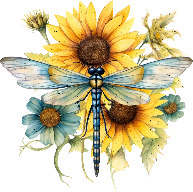 Vibrant Dragonfly & Sunflower Floral DTF Transfer Nature Design