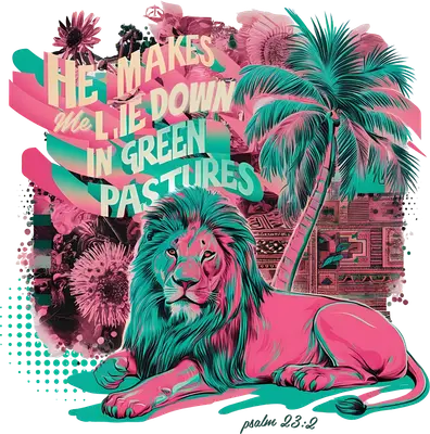 Immerse yourself in faith and vibrant style with this unique DTF transfer featuring a majestic lion resting peacefully amidst lush green pastures, a tropical palm tree, and abstract floral elements. Rendered in a stunning palette of hot pink, teal, and soft cream, the design powerfully showcases the scripture "HE MAKES ME ME LIE DOWN IN GREEN PASTURES" from Psalm 23:2. This eye-catching design is a powerful declaration of peace and divine provision, making it a truly inspirational and ready to press graphic for any garment. This inspiring design is perfect for individuals who want to wear their faith boldly and beautifully. It's an ideal iron on transfer for members of church youth groups, spiritual retreat attendees, or anyone seeking daily encouragement. Craft custom apparel for mission trips, Bible study groups, or as thoughtful gifts for confirmations, baptisms, or simply to uplift a friend. Small t-shirt businesses and crafters looking for unique heat transfer designs will find this a popular addition to their faith-based collections. Applying this heat press transfer is simple and straightforward, designed for hassle-free customization. It adheres flawlessly to a wide range of materials including cotton, polyester, cotton-poly blends, and even nylon. Achieve professional results with a heat press (300-325°F for 15 seconds, medium pressure) or a household iron. There's no weeding required—just peel and press! Create stunning custom t-shirts, cozy hoodies, stylish tote bags, unique pillow covers, or even personalized denim jackets. For lasting durability, wash garments inside out and tumble dry on low. Our ready to press transfer ensures exceptional quality, featuring vibrant, full-color printing that captures every fine detail of this powerful design. Enjoy a crack-resistant finish that feels soft to the touch, without the heavy, stiff feel often associated with vinyl. Each direct to film transfer is meticulously printed on premium DTF film with a robust adhesive backing, guaranteeing a professional and enduring application every time. Elevate your apparel with a design that speaks volumes of faith and strength.