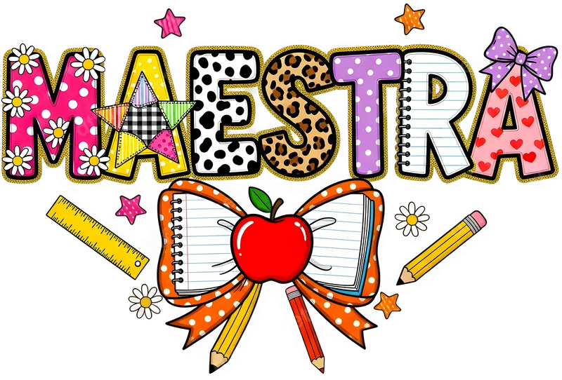 See allThis vibrant "Maestra" (Spanish for "teacher") DTF transfer is a true celebration of educators. Featuring bold, colorful letters with diverse patterns like daisies, patchwork, leopard print, and polka dots, it creates a playful yet sophisticated look. Adorned with a charming apple, school notebooks, pencils, and stars, this ready to press design perfectly captures the spirit of teaching. It's an eye-catching design that brings warmth and appreciation to any garment. This unique apparel transfer is ideal for Spanish-speaking teachers, bilingual educators, or anyone looking to honor a special Maestra. Perfect for Teacher Appreciation Week, back-to-school events, end-of-year gifts, or simply showing everyday gratitude. It makes a thoughtful present for a mentor, colleague, or beloved teacher, allowing them to proudly display their profession with style. Applying this heat press transfer is incredibly easy! Our professional-grade direct to film transfer works beautifully on a wide range of fabrics, including cotton, polyester, and their blends. Simply use a heat press at 300-325°F for 15 seconds with medium pressure. For home users, a household iron can also achieve excellent results. Best of all, there's no weeding or intricate layering required, making customization a breeze. Experience superior quality with this durable t-shirt transfer. The colors are incredibly vibrant, ensuring your design stands out. Our premium DTF film is engineered to be crack-resistant and maintain its soft, flexible feel even after multiple washes. With strong adhesive properties, your new shirt design will look fantastic and last for years, providing a professional finish that truly elevates any item.