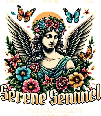 Discover the enchanting 'Serene Sentinel' DTF transfer, a truly captivating design featuring a beautiful angelic figure adorned with vibrant, colorful flowers and delicate butterflies. This ready to press design emanates tranquility with its serene expression, elegant wings, and a halo, all framed by lush botanical elements in a neo-traditional art style. The bold 'Serene Sentinel' text anchors this stunning graphic, making it a powerful visual statement on any garment. This ethereal iron on transfer is perfect for anyone seeking inspiration, beauty, or a touch of spiritual elegance in their apparel. Ideal for small t-shirt businesses looking to expand their unique inventory, crafters creating personalized gifts, or individuals who appreciate artful designs. It makes a thoughtful gift for birthdays, Mother's Day, or simply to express personal style. Perfect for those drawn to celestial themes, nature, or guardian angel imagery, this heat transfer design adds a sophisticated touch to any garment. Applying this heat press transfer is a breeze on cotton, polyester, cotton-poly blends, and nylon fabrics. Achieve professional results with a heat press (300-325°F for 15 seconds, medium pressure) or even a household iron. No tedious weeding or layering is required—simply peel and press! Create stunning custom t-shirts, hoodies, tote bags, denim jackets, or even decorative pillow covers. For lasting durability, wash garments inside out and tumble dry on low heat. Experience superior quality with this premium ready to press transfer. Our designs boast vibrant, full-color printing that captures every fine detail of the artwork, from the intricate wings to the delicate butterfly patterns. The result is a crack-resistant, soft-to-the-touch finish with none of the heavy, stiff feel often associated with vinyl. Each direct to film transfer is printed on high-grade DTF film with a robust adhesive backing, ensuring professional, long-lasting results every single time.
