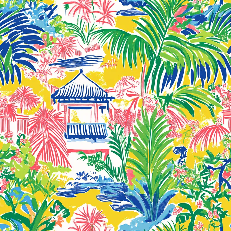 Vibrant Tropical Pagoda Jungle DTF Transfer | Colorful Palm Leaf Design