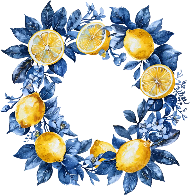 Vibrant Watercolor Lemon & Indigo Leaf Wreath DTF Transfer