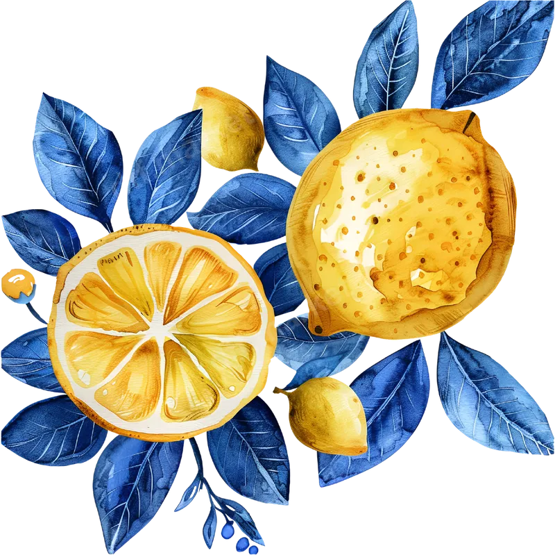 Vibrant Watercolor Lemon Slice & Whole Fruit DTF Transfer with Blue Leaves