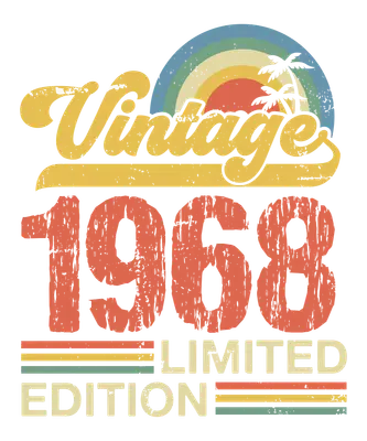 See allEmbrace the spirit of a bygone era with this vibrant "Vintage 1968 Limited Edition" DTF transfer. Featuring a distressed, retro-inspired font for the year 1968, and a script "Vintage" overlayed on a colorful sunset-style arc with subtle palm tree silhouettes, this design captures nostalgic charm. The phrase "LIMITED EDITION" anchors the design with complementary striped accents, making it a perfectly themed and ready to press graphic for commemorating a special birth year.