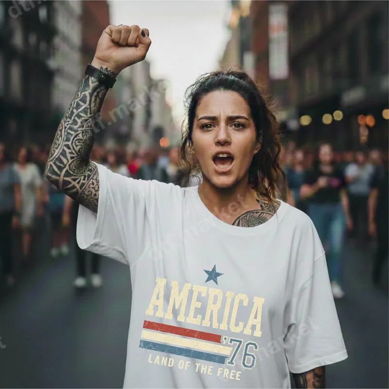 See allThis vibrant DTF transfer showcases a distressed "AMERICA" design, complete with a star, vintage flag stripes, and the iconic "76" and "LAND OF THE FREE" slogan. The rugged, Americana aesthetic perfectly captures historical pride and freedom, making it a powerful statement piece. This ready to press design brings a patriotic spirit to any garment. This patriotic iron on decal is ideal for anyone who loves their country, celebrates American history, or wants to express their pride in the land of the free. It's perfect for Fourth of July celebrations, Memorial Day, Veterans Day, election events, or everyday wear. This versatile heat press design also makes an excellent gift for history buffs, veterans, or anyone passionate about their American heritage. Our direct to film transfer ensures a smooth, hassle-free application on a wide range of fabrics, including cotton, polyester, and their blends. Simply use a heat press at 300-325°F for 15 seconds with medium pressure. For smaller projects or home use, a household iron can also be used. Enjoy a professional finish without any tedious weeding, unlike traditional vinyl transfers. Experience exceptional quality with our premium DTF transfers. Each custom transfer boasts vibrant, true-to-color prints that are remarkably soft to the touch and incredibly durable. Designed to resist cracking and fading, your apparel transfer will maintain its striking appearance wash after wash. We use professional-grade DTF film with strong, reliable adhesive, ensuring your design adheres flawlessly.