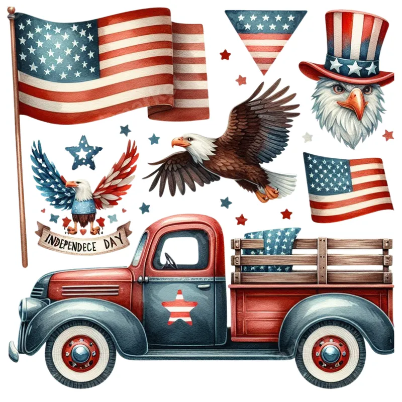 See allDive into American pride with this vibrant collection of patriotic designs, offered as a premium DTF transfer. This graphic features iconic symbols: a majestic bald eagle, waving American flags, and a classic vintage pickup truck adorned with stars. Each element is beautifully rendered in a watercolor style, evoking nostalgic Americana. This ready to press transfer is perfect for quickly customizing apparel with a beloved national theme. This versatile heat press transfer is ideal for anyone looking to showcase their love for the USA. It’s perfect for patriotic holidays like the 4th of July, Memorial Day, or Veterans Day. Crafters, small business owners creating custom apparel, and individuals seeking unique gifts for veterans, military families, or history enthusiasts will find this design appealing. Create memorable custom shirts, bags, or home decor items that resonate with American spirit. Applying your new heat transfer is straightforward. Our high-quality iron on transfer works seamlessly on cotton, polyester, and blends. For best results, use a heat press at 280-300°F (138-149°C) with medium pressure for 6-10 seconds, then perform an instant hot peel. Unlike vinyl transfers, there's no tedious weeding required, making your creation process fast and enjoyable. You can even apply with a household iron with firm, even pressure. Experience superior quality with every print. Our DTF transfers boast incredibly vibrant, crack-resistant colors and a soft, lightweight feel. Engineered for durability, they maintain integrity wash after wash. Each apparel transfer is produced using professional-grade DTF film and strong adhesive for a flawless, long-lasting application that feels premium to the touch.